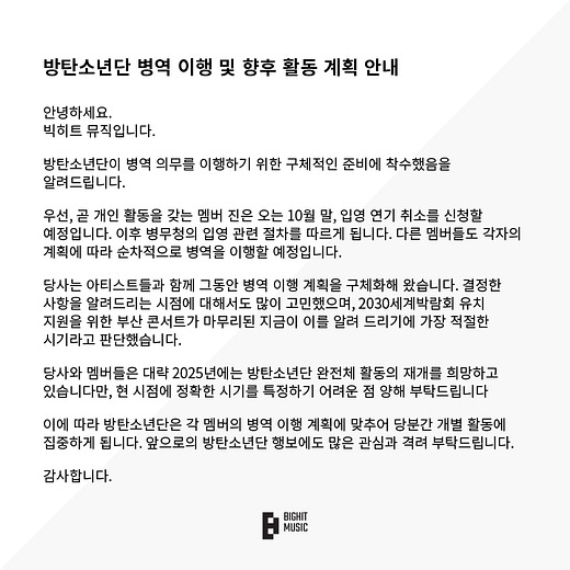 “Both the company and the members of BTS are looking forward to reconvening as a group again around 2025 following their service commitment,” BigHit Music said.
