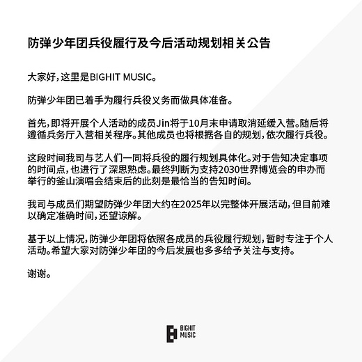 In an official press release from BigHit Music, BTS’s record label, said the group “is currently moving forward with plans to fulfill their military service”, with eldest member Jin initiating the process as soon as his scheduled solo release is concluded at the end of October. It added other members of the group plan to carry out their service based on their own individual plans.